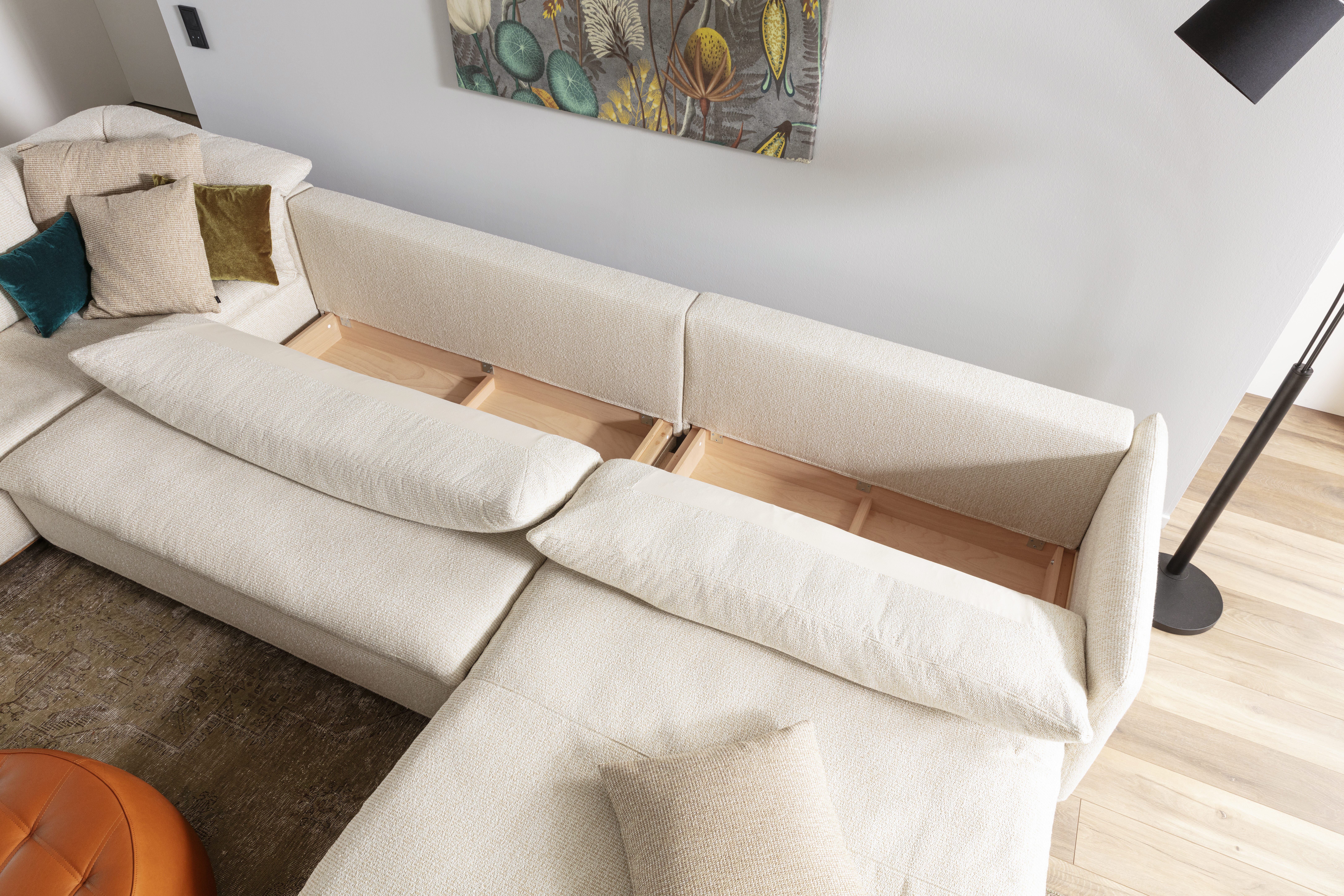 Die Polsterauflagen machen den besonders kuscheligen und softigen Charakter des Ecksofas aus – man sitzt sehr bequem und schläft ausgesprochen gut darauf. Dieses interessante Ecksofa mit Schlaffunktion hat unter der Sitzfläche stabile Bettkästen aus Buchenholz, die in das Sofagestell integriert sind.